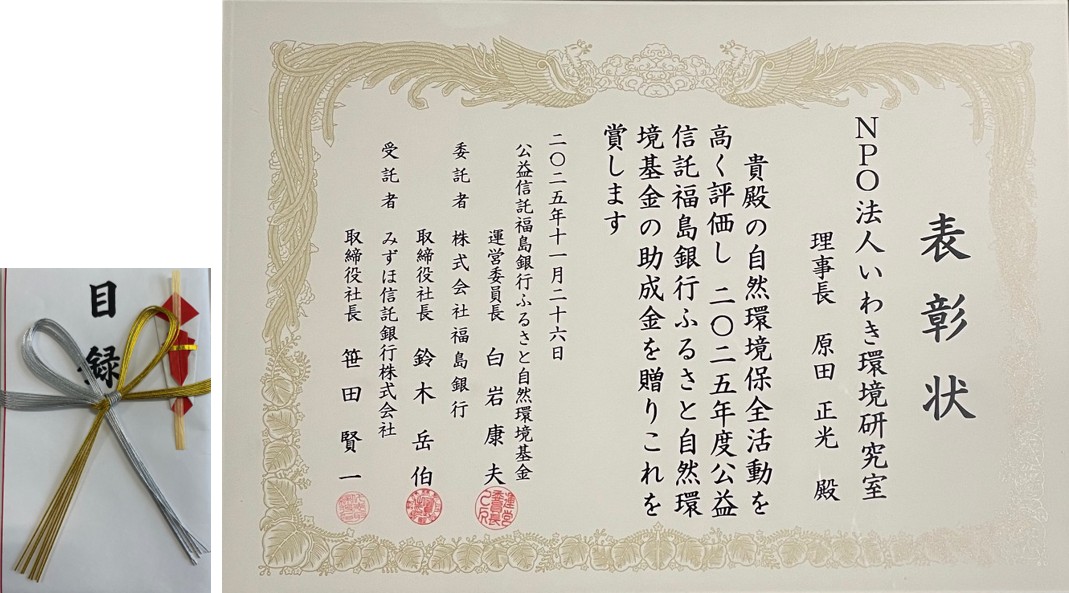 このたび、公益信託福島銀行ふるさと自然環境基金の助成金申請をしていました「外来種オオキンケイギクの効果的な防除手法を探る実践的取組」が採択されました。福島銀行本社にて11月26日に行われた贈呈式に原田理事長が出席して賞状と目録をいただいてまいりました。ご支援を賜りました福島銀行様をはじめ、選考にご尽力いただいた関係者の皆様に心より感謝申し上げます。